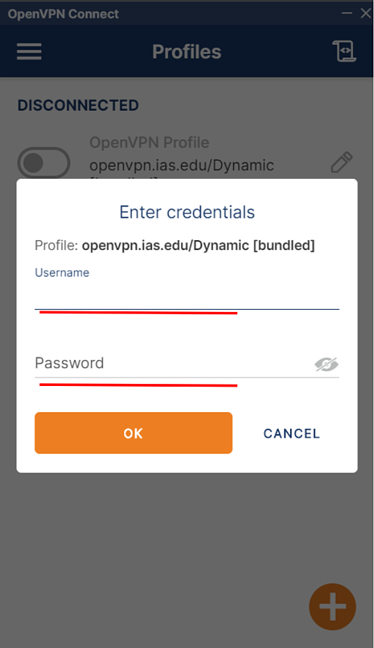 The installation and use of OpenVPN will require your IAS Credentials. Make sure you fill in these fields correctly and do not include the domain of @ias.edu in your username.