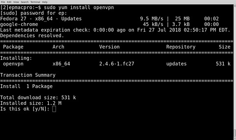 - Install the OpenVPN client. For RedHat-based systems (CentOS, Springdale Linux, Fedora), type sudo yum install openvpn.