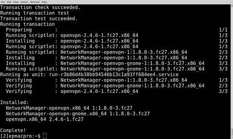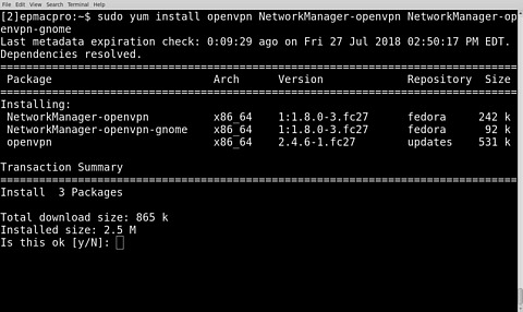 Open a terminal and install the Network Manager plugins for OpenVPN and Gnome. For RedHat based system, type sudo yum install openvpn NetworkManager-openvpn NetworkManager-openvpn-gnome.