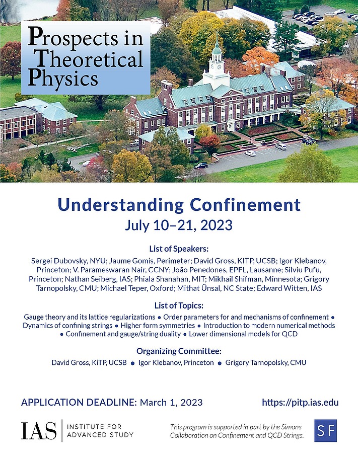 Sergei Dubovsky, NYU; Jaume Gomis, Perimeter; David Gross, KITP, UCSB; Igor Klebanov, Princeton; V. Parameswaran Nair, CCNY; João Penedones, EPFL, Lausanne; Silviu Pufu, Princeton; Nathan Seiberg, IAS; Phiala Shanahan, MIT; Mikhail Shifman, Minnesota; Grigory Tarnopolsky, CMU; Michael Teper, Oxford; Mithat Ünsal, NC State; Edward Witten, IAS.