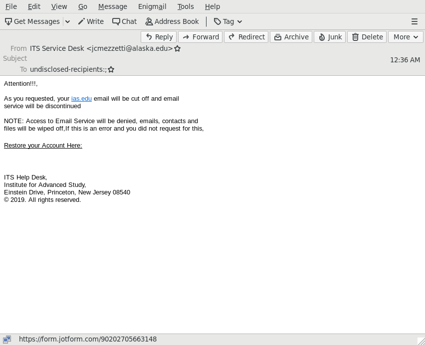 - As you can see, the link sends you to form.jotform.com. This address is not associated with ias.edu. Don't click.
