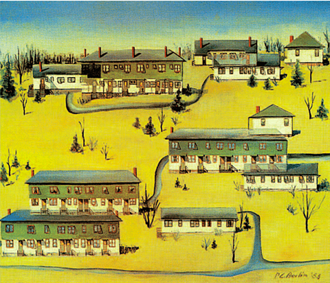 As time went by and the Institute grew, the need for designated Member housing located close to the Institute became apparent. In 1941, the Board of Trustees began investigating the option of building apartments for visiting scholars. The urgency of the need called for quick action. Unfortunately, building during wartime was impossible, and the Institute looked into the possibility of prefabricated housing. It took until 1946 before firm plans were set to erect dwellings consisting of four six-family units and seven two-family units between Cook and Goodman Roads. Julian Bigelow, Member in the Electronic Computer Project and later the Schools of Mathematics and Natural Sciences, offered to negotiate on behalf of the Institute with the Federal Public Housing Authority for surplus government housing that could be made available to educational institutions. Director Frank Aydelotte, who filed the application for the housing, stressed the excellent quality of these buildings, which were not prefabricated but individually constructed at Mineville, New York, on the edge of the Adirondacks. With Bigelow’s guidance, the Institute was able to purchase eleven buildings containing thirty-eight apartments of two and three bedrooms each.