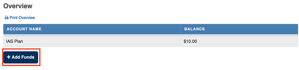 - Add Funds: Once you have successfully added a payment method, you will be able to add funds to your IAS Plan. To do this, click the "Add Funds" button. Following the prompts, select the appropriate payment method, and input the amount you would like added to your IAS Plan. Click "Continue".