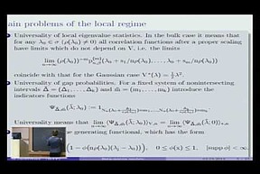 Workshop on Random Matrices and Random Systems Agenda: https://www.ias.edu/math/wrmrs/agenda Date March 31, 2014 Speakers See agenda video lecture Spectrum stablility for non-normal random matrices March 31, 2014 Ofer Zeitouni Agenda: https://www.ias.edu/math/wrmrs/agenda Read More video lecture The open quantum Brownian motion: a random walk on quantum noise March 31, 2014 Denis Bernard Agenda: https://www.ias.edu/math/wrmrs/agenda Read More video lecture Random quantum marginals March 31, 2014 Michael Walter Agenda: https://www.ias.edu/math/wrmrs/agenda Read More video lecture KPZ equation and directed polymers: exact results from the replica Bethe ansatz April 01, 2014 Pierre Le Doussal Agenda: https://www.ias.edu/math/wrmrs/agenda Read More video lecture Spectra of Large Random Stochastic Matrices and relaxation in complex systems April 01, 2014 Reimer Kuehn Agenda: https://www.ias.edu/math/wrmrs/agenda Read More video lecture Kharkov, Universal approach to β-matrix models April 01, 2014 Mariya Shcherbina Agenda: https://www.ias.edu/math/wrmrs/agenda Read More video lecture Lecture for Workshop on Random Matrices and Random Systems April 01, 2014 Balint Virag Agenda: https://www.ias.edu/math/wrmrs/agenda Read More video lecture Entropy bounds for reduced density matrices of fermionic states April 02, 2014 Elliott Lieb Agenda: https://www.ias.edu/math/wrmrs/agenda Read More video lecture Spectral theory for ASEP, XXZ and the (q,mu,nu)-Boson process April 02, 2014 Ivan Corwin Agenda: https://www.ias.edu/math/wrmrs/agenda Read More video lecture Central Limit Theorems for linear statistics for biorthogonal ensembles April 02, 2014 Maurice Duits Agenda: https://www.ias.edu/math/wrmrs/agenda Read More video lecture Variational formulas for directed polymer and percolation models on the plane April 02, 2014 Timo Seppalainen Agenda: https://www.ias.edu/math/wrmrs/agenda Read More video lecture Energy approach to Coulomb gases and log gases April 03, 2014 Sylvia Serfaty Agenda: https://www.ias.edu/math/wrmrs/agenda Read More video lecture Some probabilistic ideas at the interface of random matrix theory and zeta April 03, 2014 Ashkan Nikeghbali Agenda: https://www.ias.edu/math/wrmrs/agenda Read More video lecture Some recent results and open problems on random matrices April 03, 2014 Van Vu Agenda: https://www.ias.edu/math/wrmrs/agenda Read More video lecture Applications of random matrix theory on PCA April 03, 2014 Jun Yin Agenda: https://www.ias.edu/math/wrmrs/agenda Read More video lecture The dynamical sine-Gordon model April 04, 2014 Martin Hairer Agenda: https://www.ias.edu/math/wrmrs/agenda Read More video lecture Nonlinear fluctuating hydrodynamics in one dimension April 04, 2014 Herbert Spohn Agenda: https://www.ias.edu/math/wrmrs/agenda Read More Non-equilibrium Dynamics and Random Matrices (nedrm)